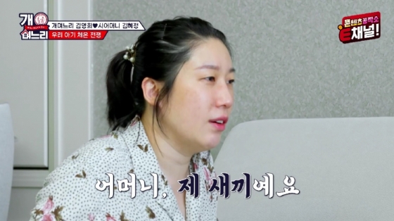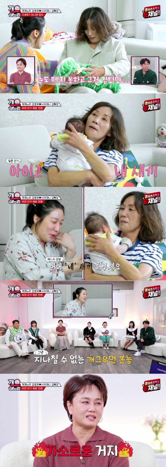 지난 1일 오후 방송된 E채널 '개며느리'에는 김영희 시어머니가 손녀를 처음 안아보는 모습이 그려졌다.