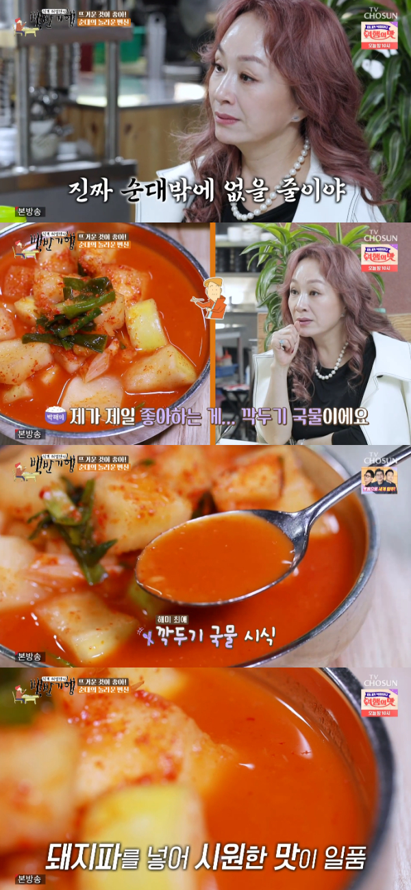 '백반기행'에서 뮤지컬 배우 겸 영화배우 박해미가 순대 맛집의 깍두기 맛에 반했다.