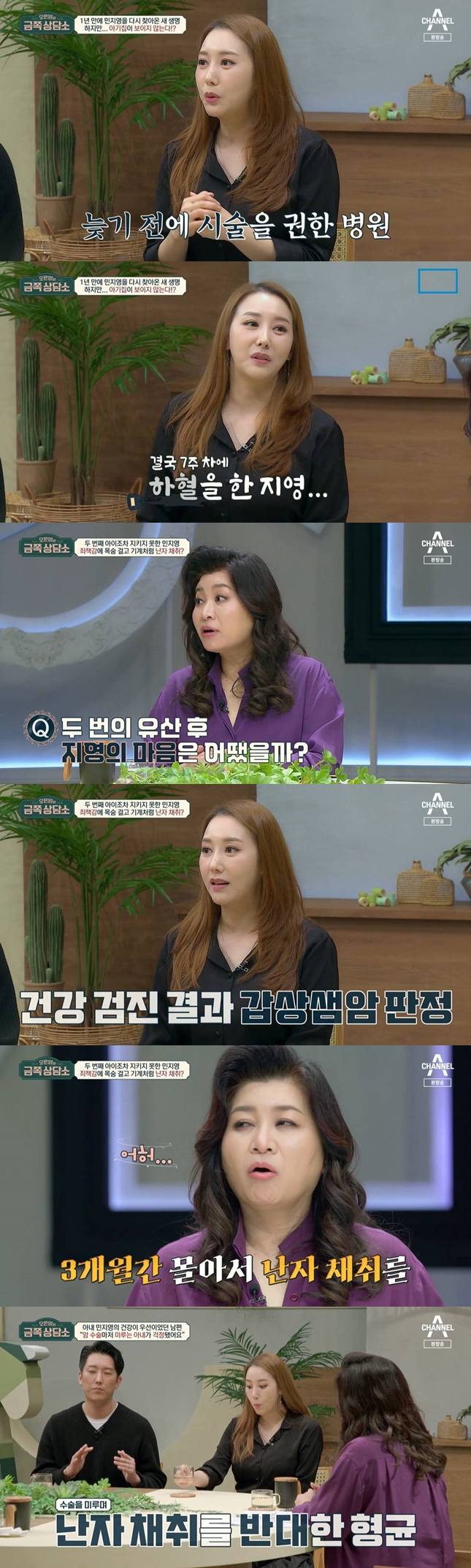 이후 민지영, 김형균 부부는 배란 유도제의 도움을 받아 자연 임신에 성공했다고. 하지만 민지영은 "그런데 피검사로 임신 수치가 올라가는데 아기집이 안 보이더라"며 "병원에서 '자궁 외 임신이 될 거 같아 위험할 거 같다'고 하더라. 7주 넘어가서 하혈을 하게 됐다"며 두 번째 유산을 하게 됐다고 밝혔다.