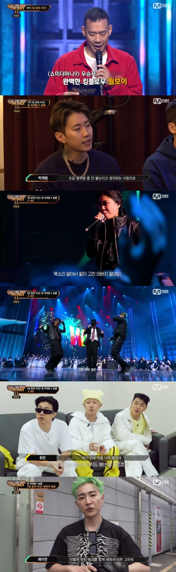 지난 2일 방송된 Mnet 경연 프로그램 '쇼미더머니 11'에서 '팀 음원 미션' 무대가 펼쳐졌다. 그릴즈(릴보이, 그루비룸) 팀은 '위하여'(We Higher), 콰이올린(더콰이엇, 릴러말즈) 팀은 '아저씨', 슬레이(박재범, 슬롬) 팀은 'WE', 알젓(저스디스, 알티) 팀은 '마이웨이'(MY WAY) 무대를 선보였다.