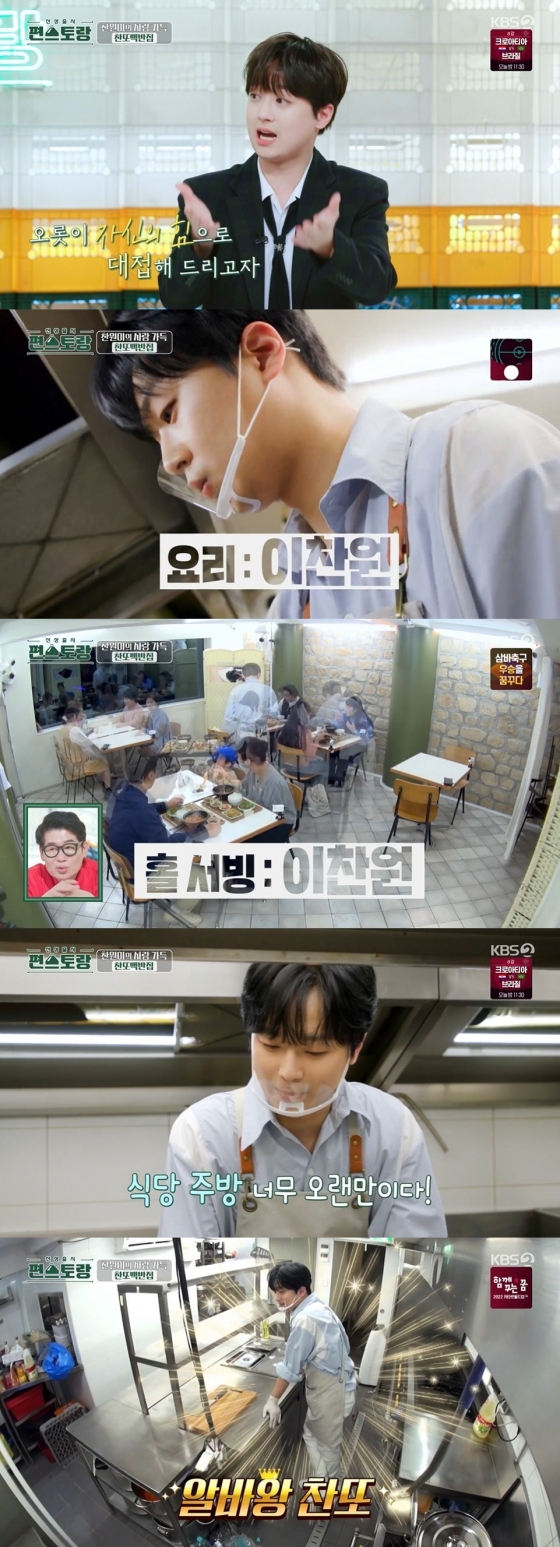 이날 이찬원은 "은혜에 보답하고자 연 식당이기 때문에 제가 처음부터 끝까지 다 준비했다. 오롯이 제가 대접을 하는 게 맞지 않나 싶어서 다른 분들 도움을 따로 청하지는 않았다"라고 혼자 식당을 열게 된 이유를 설명했다.