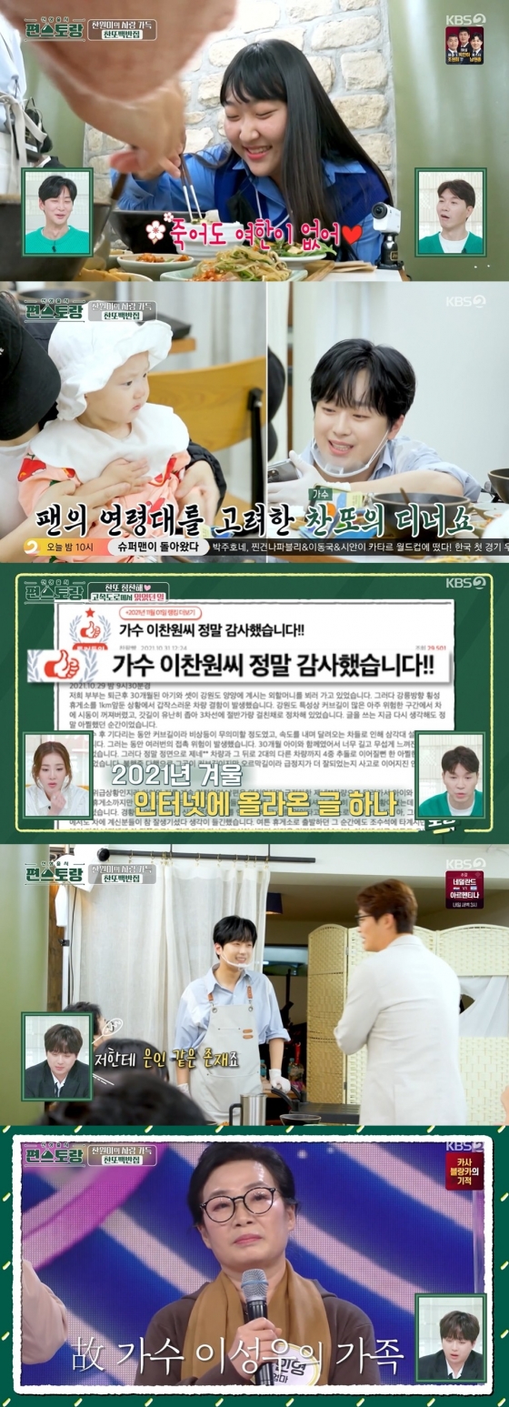 이어 이찬원은 모자지간 손님을 보고 "저한테는 은인 같은 존재다"라며 "'진또배기'로 활동했던 원곡자 고(故) 이성우 선배님의 아내분과 아들이다"라고 특별한 인연을 소개하기도 했다.