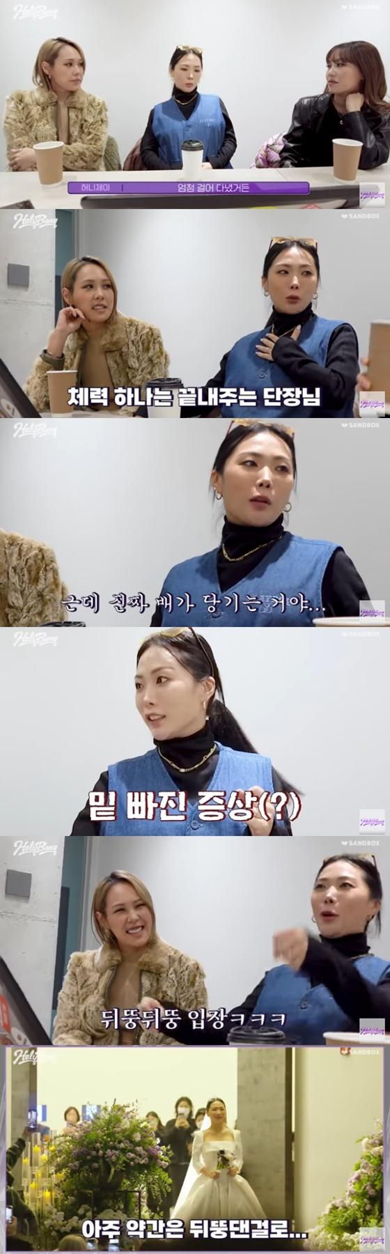 이날 허니제이는 일본으로 신혼여행을 다녀왔다고 밝혔다. 그는 "내가 좀 오버해서 첫날에 엄청 걸어 다녔다. 우리가 숙소가 좀 멀었다. 내가 체력이 좋아서 믿고 걸었는데 배가 엄청 땅겼다. 처음으로 배가 당겼다. 산모들한테 밑 빠진 증상이라는 게 있다"고 밝혔다.