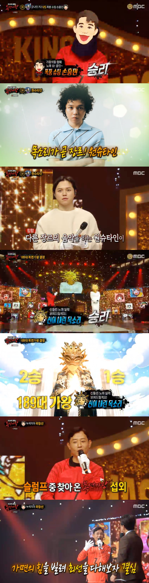 이후 가왕전에서 현 가왕 '신이 내린 목소리'가 부른 선우정아의 '생애'를 불렀고, 판정 결과 '신이 내린 목소리'이 3연승을 차지했고, 패배한 가면을 벗은 '폭풍 슈팅 손흥민'의 정체는 녹색지대 곽창선이었다. 곽창선은 "방송에서 이렇게 혼자 오래 노래해 보기는 처음이다. 허스키한 권선국 씨 목소리에 늘 묻혔기에 제 목소리를 못 알아채실 줄 알았다"고 출연 소감을 전했다. 곽창선은 "긴 공백기로 인해 노래에 자신이 없었다. 어느 날 갑자기 고음이 안 올라가더라"며 "그러던 중 섭외 연락을 받았다. 가면의 힘을 빌려 최선을 다해보기로 했다. 이번 무대를 준비하며 다시 가수로 활동하고 싶다는 목표가 생겼다"고 말해 감동을 자아냈다.