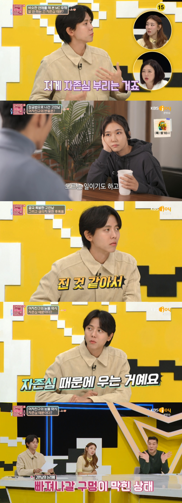 이날 고민남의 여자친구는 화가 나면 말없이 자리를 피했다. MC 한혜진은 "화 자체를 표출하는 방법을 몰라서 그러는 거다. 화를 내서 상대를 잃은 적이 있어서 안으로 삭히는 사람이 많다"고 말했다. MC 주우재는 "자존심이 되게 세다. 지는 거 절대 싫어한다. 싸움이 시작되면 자존심 부리는 거다"라고 말했다.