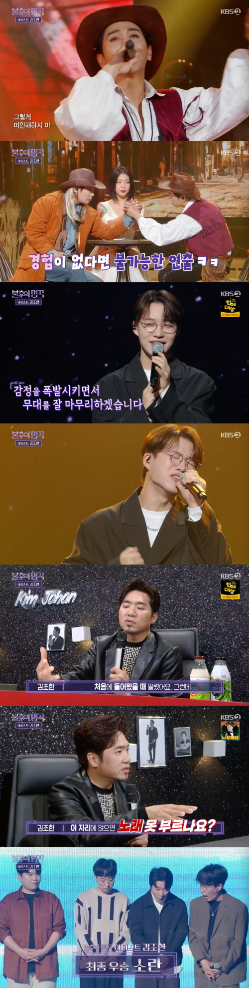 이어 "이 자리에 앉으면 노래 못 부르나요?"라고 돌발질물을 했고, 신동엽은 "처음에 김조한씨가 노래를 부르면 김조한씨 특유의 창법과 음색이 있으니 후배들이 위축될까해서 그랬다. 한 소절만 부탁드린다"라고 전했다. 이후 김조한은 관객들을 위해 노래 한 소절을 불러 감동을 자아냈다. 투표결과, 밴드 소란이 홍대광을 이기고 최종우승을 차지해 왕중왕전으로 가는 마지막 티켓을 거머줬다.