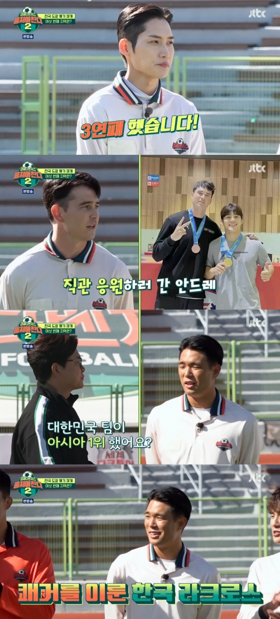 럭비 팀 코치를 맡게 된 안드레는 "실업팀 코치로 데뷔해 일반부 금메달을 땄다"고 전했다. 이어 "시합장 옆에 레슬링 장이 있었는데 현우 형이 메달을 따는 모습을 봤다"고 전했다.