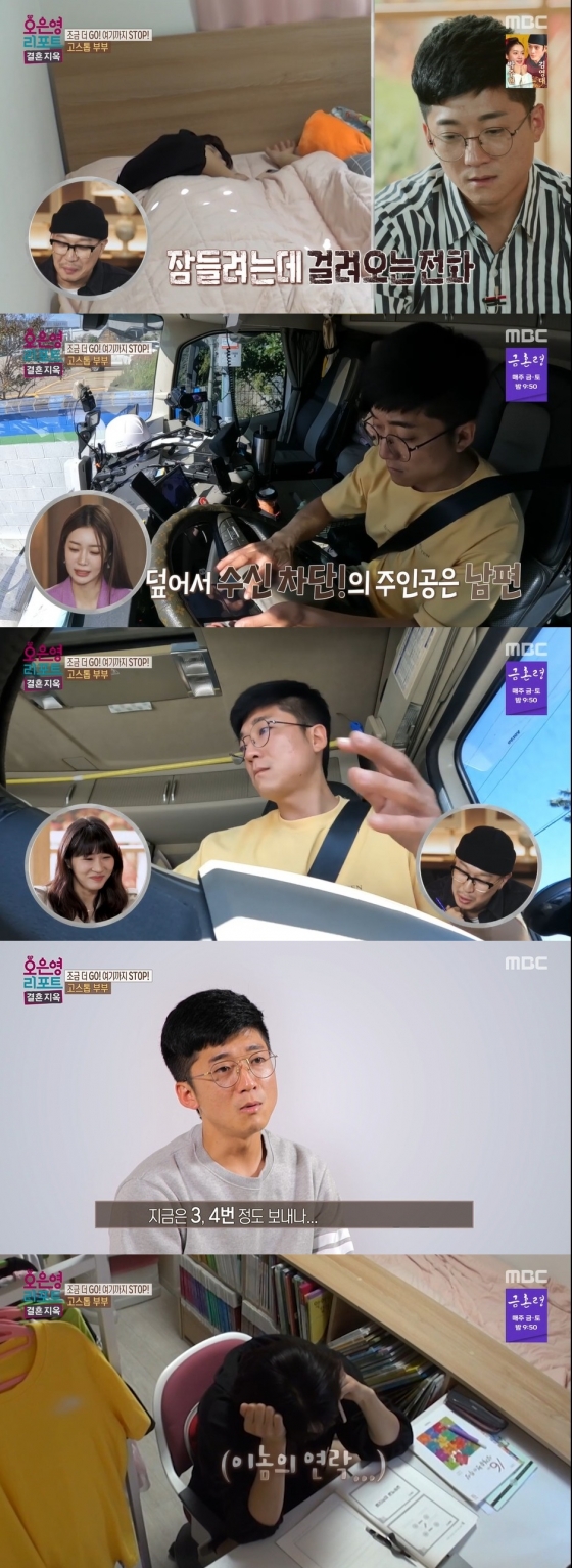 남편은 화물차 운전 일을 하며 틈날 때마다 아내에게 통화를 시도하는 모습을 보였다. 아내는 쪽잠을 청하는 도중에도 걸려오는 남편의 전화에 힘들어했다.