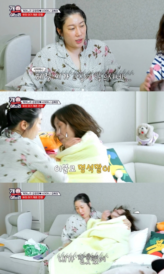 영상에는 김영희가 시어머니를 '혜정씨'라고 격의 없이 부르거나, "역지사지를 해봐야 한다"며 손녀를 꽁꽁 싸매는 시어머니에게 이불을 덮어주는 모습이 담겨 있다.