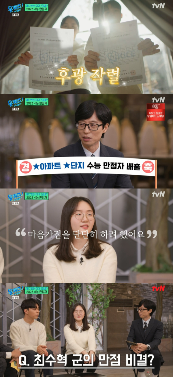 21일 오후 방송된 tvN 예능프로그램 '유 퀴즈 온 더 블럭'에서는 2023년 대학 수학 능력 만점자 최수혁 권하은이 게스트로 출연했다.