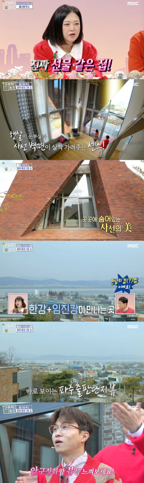 이날 박성광과 박영진은 산타와 루돌프로 분장한 채 오프닝을 시작했다. 두 사람은 파주시 서패동에 위치한 크리스마스 선물 같은 집을 방문했다. 파주 출판단지와 쇼핑 아울렛이 인접한 곳으로 적벽돌의 유니크한 외관이 눈길을 끌었다. 두 사람은 물론 스튜디오의 코디들은 사선 벽돌을 쌓아올린 외벽에서 눈을 떼지 못했다.