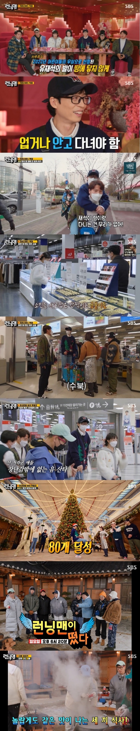 이날 '크리스마스 특집'으로 꾸며져 '유산타와 여섯 루돌프' 레이스로 진행됐다. 멤버들은 각자 30만원 한도 내에서 필요한 물건을 마음껏 고르되, '어린이들의 우상' 유재석의 발이 땅에 닿지 않도록 업거나 안고 다녀야 했다. 만약 유재석의 발이 땅에 닿으면 새해 첫 촬영 시간이 10분씩 당겨진다.