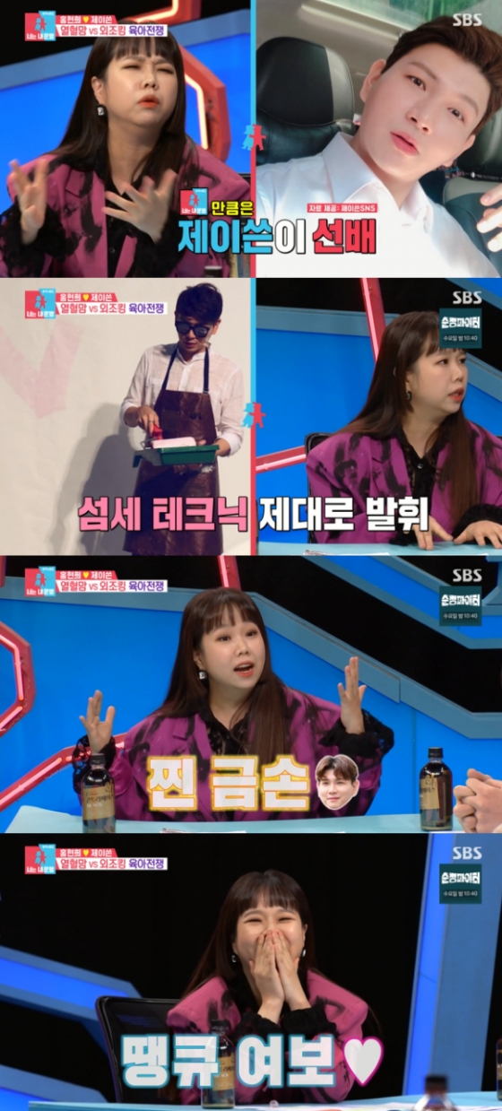 MC 서장훈은 홍현희에 "제이쓴이 골병이 나서 앓아누웠다고"라고 물었다. 홍현희는 "사실 많이 도와준다. 제가 집에만 있으면 병이 난다. 아기를 낳았는데 우울함이 있더라. 남편이 '몸만 괜찮으면 활동해도 돼' 해서 100일까지 이쓴씨가 데리고 잤다"고 전했다. 오상진은 "진짜 현희 씨는 술잔을 놓고 멀리서 쳐다보고 생사확인만 하더라"라고 말해 웃음을 자아냈다.