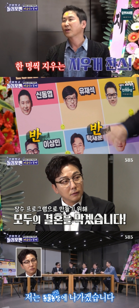 이날 신동엽은 '돌싱포맨' 대기실에 등장해 "부지런하게 돈 벌고 있다는 얘기를 듣고 '어떻게 돈 버나'하고 왔다"고 전했다. 탁재훈은 신동엽에 "신동엽 씨의 예상은 어느 쪽인지"라고 물었다. 신동엽은 "막 헷갈릴 때는 지우개 찬스를 쓰면 된다. 한 명씩 지우는 '이 사람은 안된다'"라며 후보에서 한 명씩 빼자고 제안했다. 신동엽은 테이블을 치며 "탁재훈"을 외쳤다.
