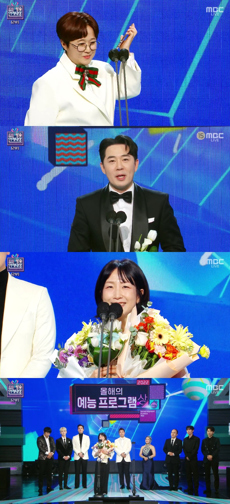 이날 여자 최우수상은 '라디오스타'의 안영미에게 돌아갔다. 안영미는 코로나19 확진으로 시상식에 참석하지 못했다. 이에 소속사 대표인 송은이가 대리 수상에 나섰고, 안영미와 전화 연결을 했다.