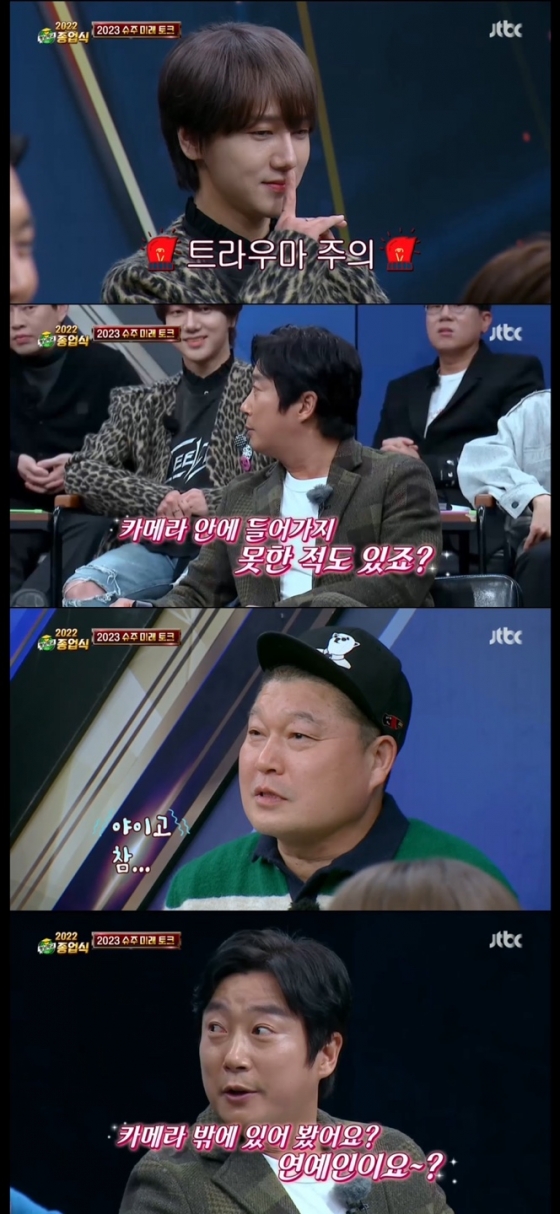 이어 강호동은 "어떻게 하면 안 떨 수 있냐"라고 질문했고, 예성은 "신인시절 때부터 예능을 하다가 트라우마 같은 게 없어야 한다"라고 덧붙였다. 신인 때 어떤 트라우마가 있었냐는 김희철의 물음에 신동은 대답하려는 예성의 말문을 막으며 과거 강호동이 예성에게 조용히 하라며 손가락을 입에 갖다 대었던 제스처를 취해 다시 한번 예성을 의기소침하게 만들어 모두를 폭소케 했다.
