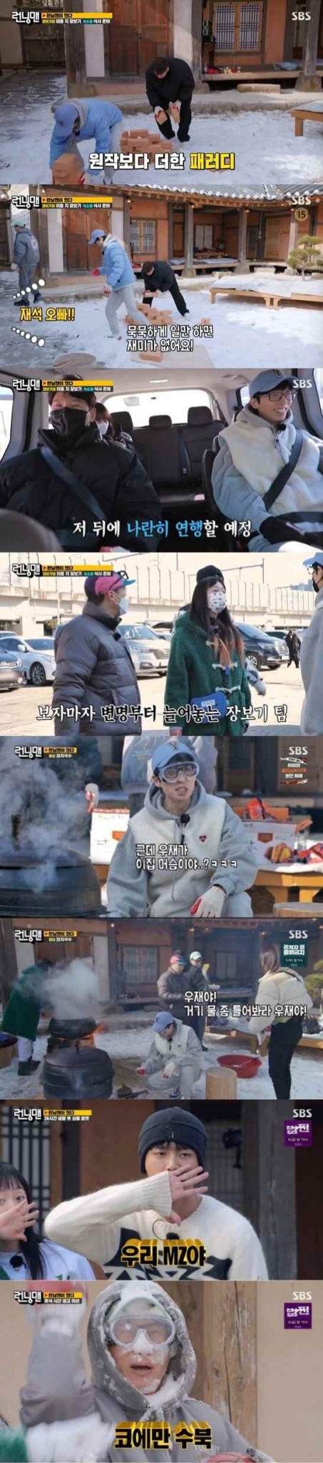 반면 무경험자 지석진은 불이 잘 붙지 않는 장작에 무작정 신문지를 던져 타박을 받는가 하면, 송지효는 송지효는 디포리와 멸치 한 봉지를 모두 육수용으로 넣어 모두를 경악하게 했다. 결국 유재석은 "어차피 나중에 수프 넣을 거니 걱정마라"고 말해 폭소를 자아냈다.