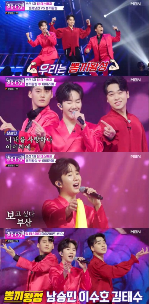 남승민은 같은 1999년~2002년생까지의 MZ세대 참가자 이수호, 김태수와 한 팀을 꾸려 '뽕끼왕성'이라는 팀명으로 데스매치에 참가했다. '뽕끼왕성'은 나훈아의 '아이라예'를 선곡하였으며, 같은 MZ세대 참가자로 구성된 '트롯남친'팀과 대결을 펼쳤다.