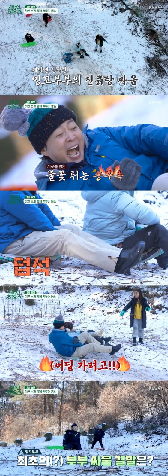 아이들의 경기에 이어 하희라를 뒤따라간 최수종은 "여보"라며 하희라의 썰매 포대를 잡았다. 최수종은 하희라에게 "내 다리 내놔"라며 거머리 작전을 개시했고, 붙잡으며 "가지 마"라고 반칙을 썼다.