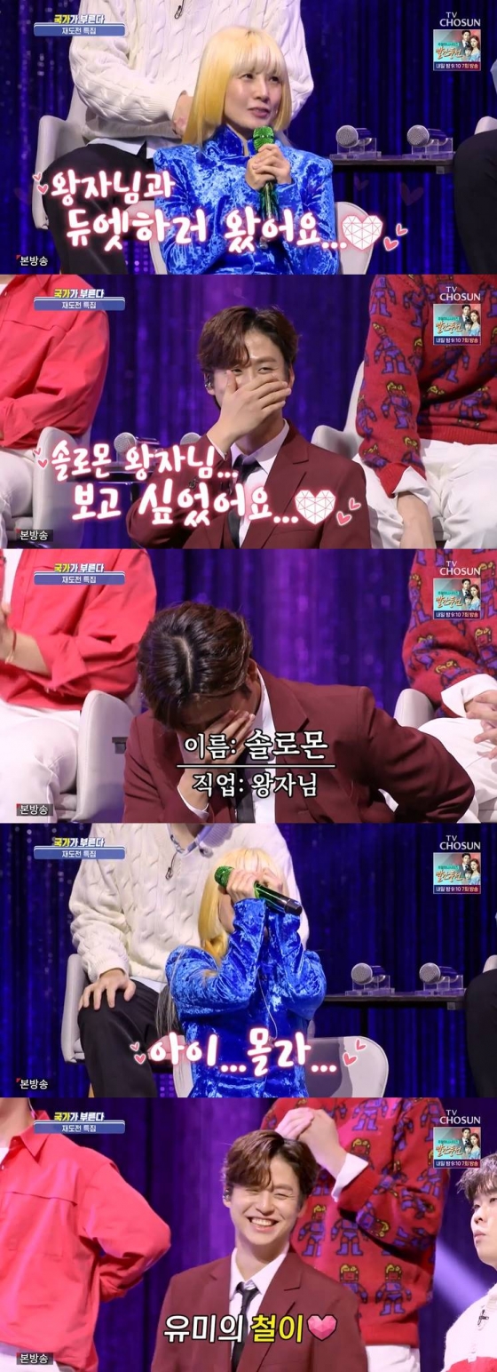 붐이 재도전에 출연한 유미에게 "오늘 특별한 목표가 있냐"고 묻자, 유미는 "있죠"라며 "우리 솔로몬 왕자님과 듀엣곡을 몹시 원하고 있다"고 말해 웃음을 자아냈다.