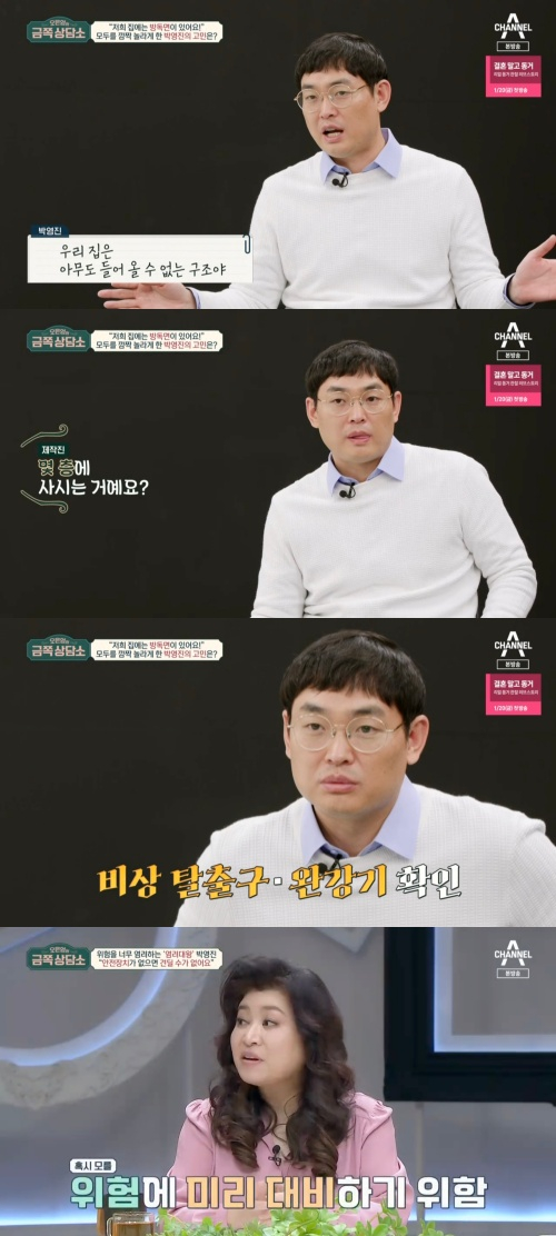 박영진은 "우리 집은 들어올 수 없는 집이다. 그런 집을 구했다"고 알렸다. 제작진은 "몇 층이냐"고 물었다. 박영진은 "얘기를 해도 되나? 왜 알려고 그러냐"라며 제작진을 의심했다. 박영진은 "집에 방독면이 있다. 항상 머리맡에 비치해 둔다. 친구 집 놀러 가면 비상 탈출구 있는지 먼저 확인하고 한다. 그게 마음이 편하다"고 전했다. 오은영은 "안전사고에 대한 두려움이 있다. 안전과민증이다"고 전했다. 오은영은 출연진 중 박영진이 가장 불안도가 높게 나왔다며 심각성을 알렸다.