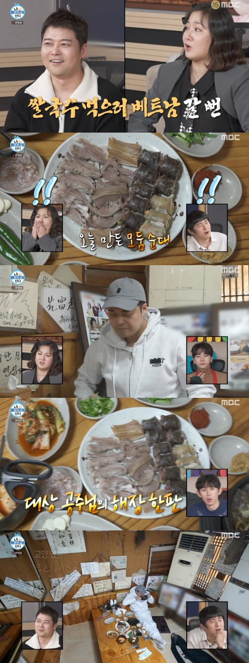 전현무는 국물을 한입 맛보고 "어우 살겠다"라며 순대를 새우장에 찍어 먹었다. 기안84는 해장국의 비주얼에 "양평까지 갈만하네"라며 이해했다. 전현무는 "제가 알고 있던 국물 맛이니까 과음 후 먹는 국물의 느낌은 아예 다르다. 상처 났을 때 연고 발라주 듯이 육수가 어루만져 주는 느낌? 국물을 미친 듯이 퍼먹었다"고 전했다. 전현무는 "저게 의사야"라고 말해 폭소를 유발했다. 전현무는 "제가 술을 잘하는 사람은 아니지만 해장은 이런 거구나"라며 만족했다.