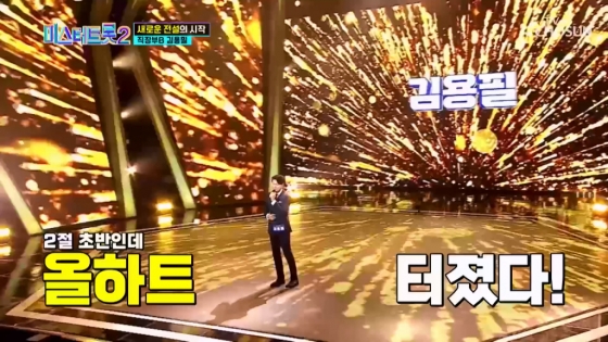 김성주가는 "앵커석에서 내려오라는 얘기 나오면 어떻게 하나"라고 말하자 김용필은 "방송 20년 동안 원없이 했고, 노래에 대한 미련이 컸기 때문에 이 자리에 서게 됐다"라고 남다른 각오를 밝혔다. 김용필은 최백호의 '낭만에 대하여'를 선곡했고 진한 감성을 전하며 올하트를 받았다.
