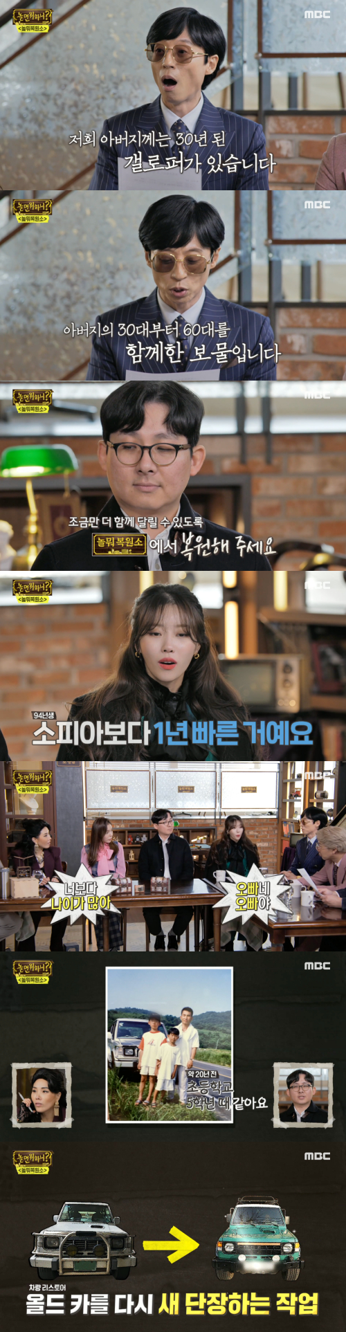 이날 멤버들은 세 번째 의뢰인을 만났다. 의뢰인 한기진 씨는 "아버지께 30년 된 갤로퍼가 있다. 남들이 보기엔 녹슨 고물일지라도 아버지의 30대부터 60대를 함께한 보물이다. 노후경유차규제로 운행이 어렵다"며 앞으로도 운전이 가능하도록 복원을 부탁했다. 1993년부터 타온 차란 말에 미주는 "94년생이다. 나한테 오빠다"라며 놀랐다. 미주는 다시 한 번 "오빠!"라며 새삼 감탄했다. 차를 본 유재석은 "차량 구매 연도가 우리 소피아보다 1년 이른 거다. 세월이 그대로 묻어난다"며 감탄했다.