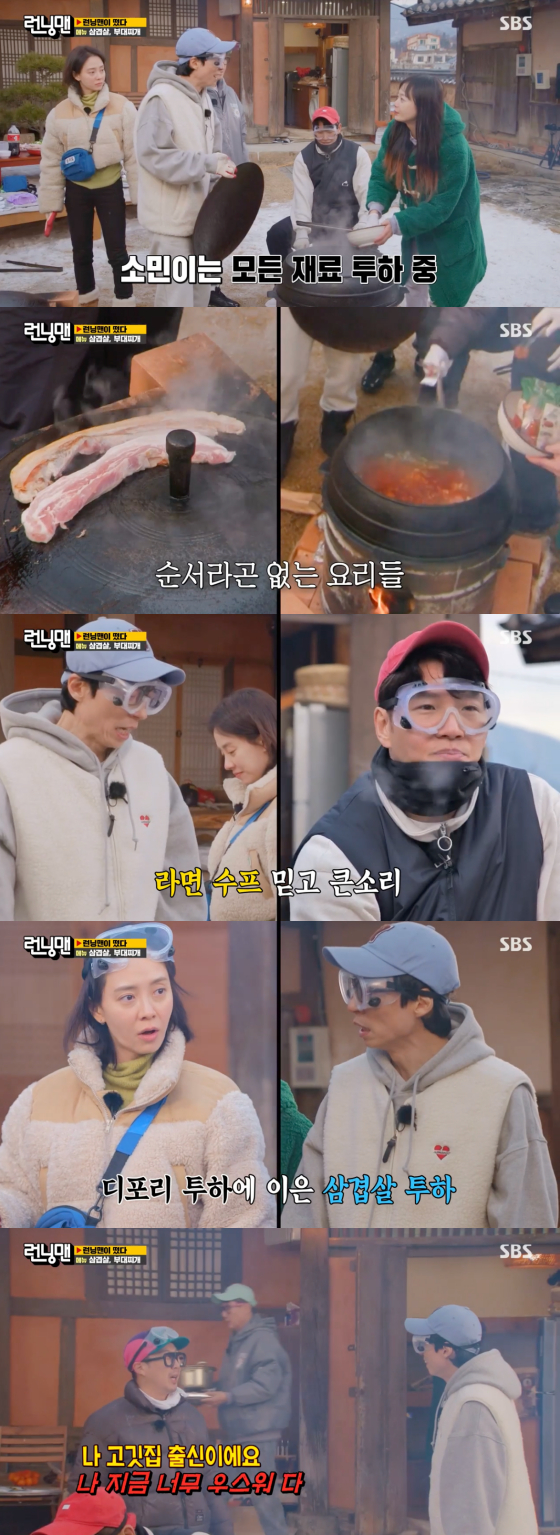 한편 멤버들이 고군분투하는 동안 주우재는 구석에서 홀로 삼겹살을 굽기 시작해 현장을 경악시켰다. 주우재는 입가심 용으로 두 줄만 굽겠다고 변명했으나 이를 못 들은 송지효는 멤버들이 눈치채지 못한 사이 가마솥 한가득 고기를 올려 폭소를 안겼다. 멤버들은 밥도 찌개도 한참 남았다며 두 사람을 구박했고, 특히 유재석은 점심에도 6개월치 디포리를 넣은 송지효에 "너 왜 이렇게 사고를 치냐"며 폭소했다.
