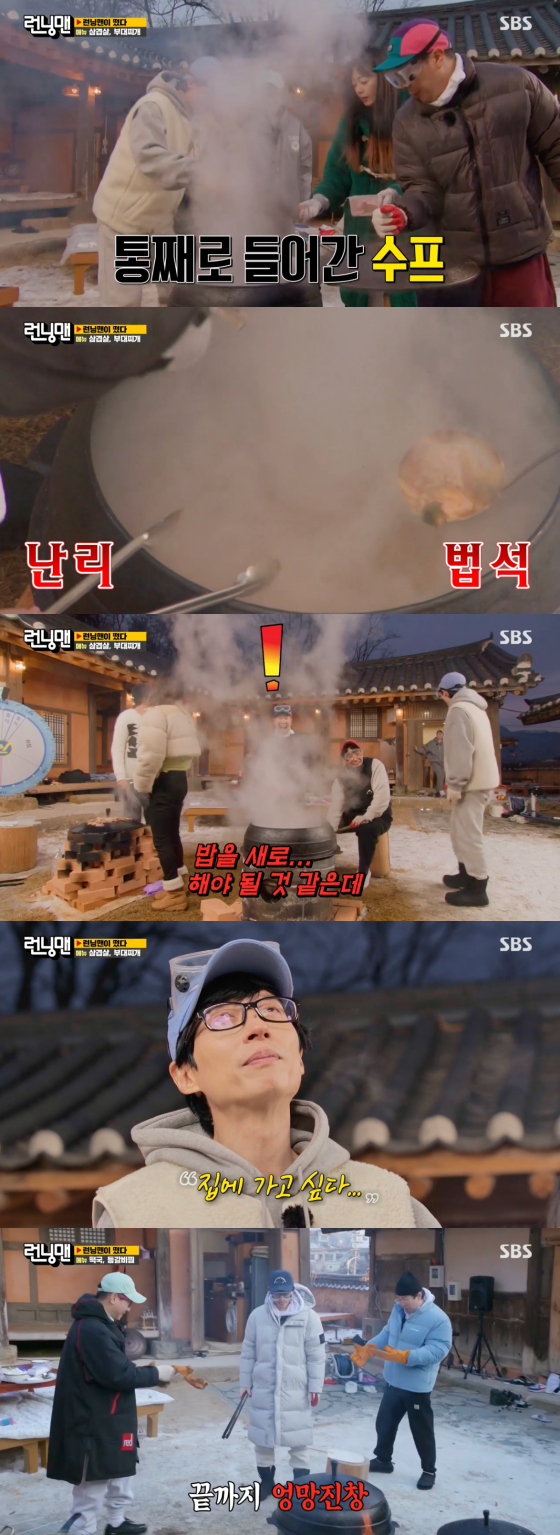 유재석은 이후 당당히 라면 수프를 들고 나섰으나, 실수로 수프 봉지를 통째로 떨어뜨려 현장을 초토화시켰다. 멤버들은 가마솥에 우르르 달라붙어 수프 꺼내기에 열중했고, 유재석은 "죄송합니다"라 사과해 웃음을 안겼다. 그러나 한차례 고비를 넘긴 후로도 저녁은 쉬이 완성되지 않았다. 지석진이 밥이 설익었다며 다시 해야할 것 같다고 고백한 것. 전소민은 지석진 대신 냄비밥을 살려 환호를 받았다.