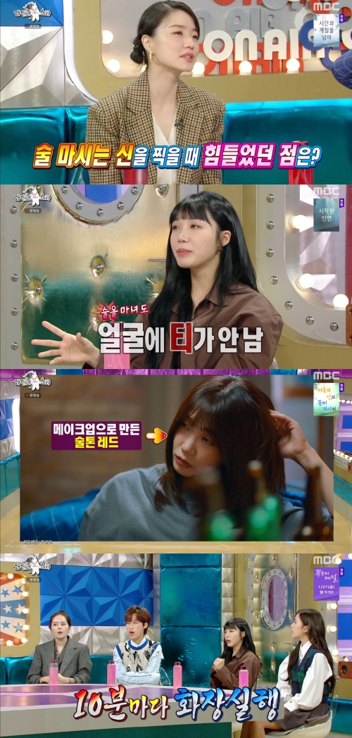 정은지는 "다른 분들은 살짝만 적셔도 올라오는데 저는 메이크업으로 대신했다"고 전했다. 또 정은지는 화장실을 자주 가서 어려움이 있다고 전했다. 정은지는 "맥주는 논알콜로 대체할 수 있는데 소주는 물로 대신해서 10분에 한 번씩 화장실을 간다"고 전했다.