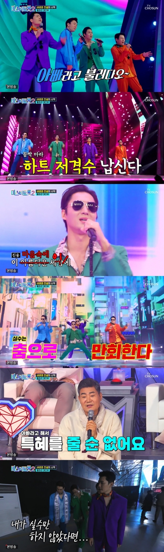 12일 오후 방송된 TV조선 경영 프로그램 '미스터트롯2-새로운 전설의 시작'에서는 대디부의 본선 1차전 팀 미션 무대가 그려졌다.