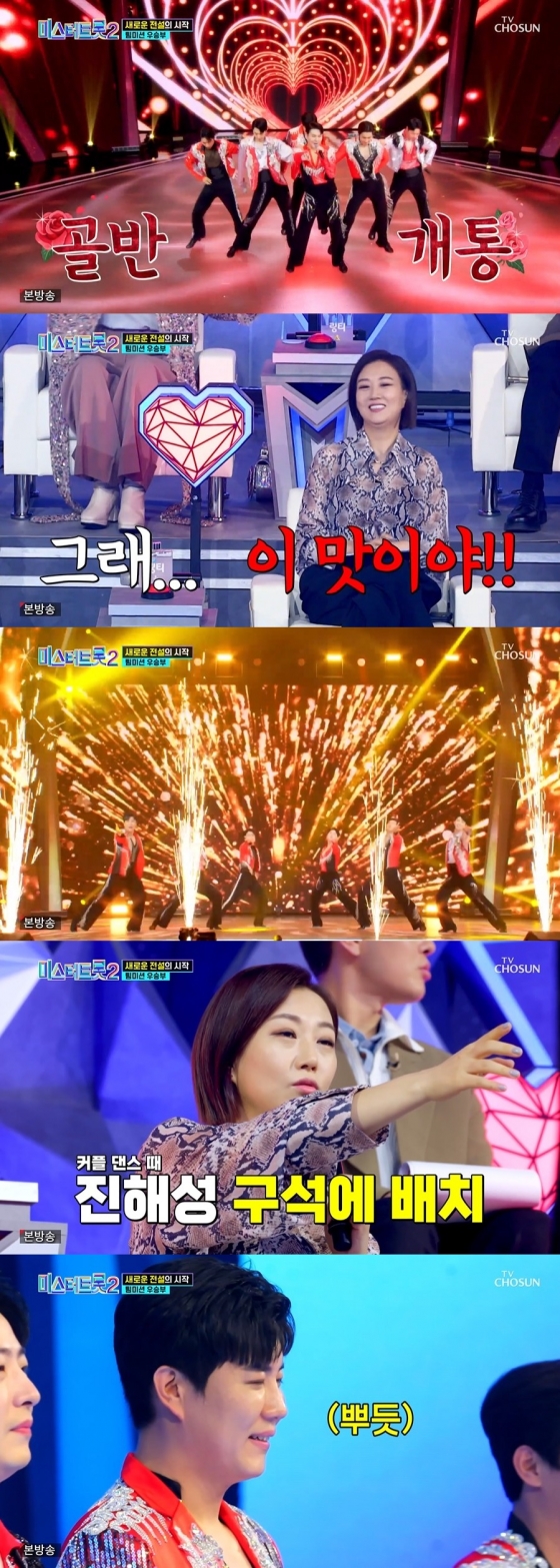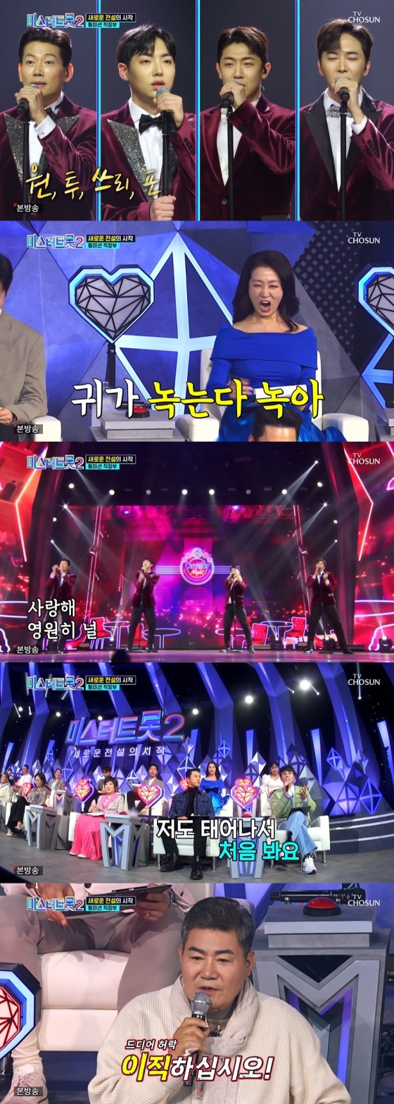 '미스터트롯2-새로운 전설의 시작' 우승부(진해성, 나상도, 안성준, 재하, 박세욱, 오주주)가 완벽한 호흡으로 올하트를 받아 다음 라운드에 진출했다.