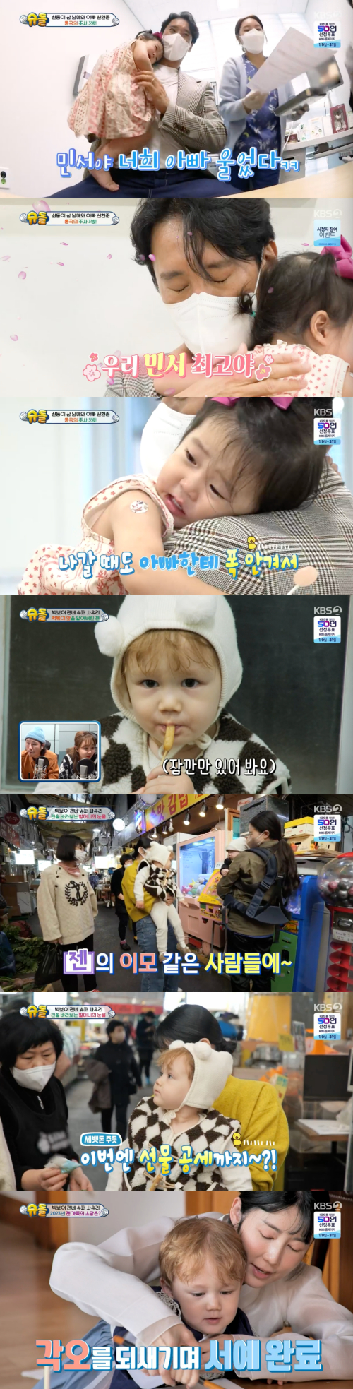 하지만 민서는 의심스러운 병원 분위기와 낯선 의사가 보낸 인사에 울음을 터뜨렸다. 의사는 "민서가 영유아 검진 3차 시기인데 1, 2차를 놓쳤다. 총 세 방의 주사를 맞아야 된다"고 말했다. 신현준은 크게 당황했고, 민서는 주사바늘에 대성통곡을 했다. 이를 지켜보던 신현준도 "우리 민서 아팠지. 우리 민서 최고야"라며 눈물을 훔쳤다. 민서를 안고 병원 복도에 나온 신현준은 다시한번 딸을 꼭 끌어안으며 딸바보 면모를 보여줬다.