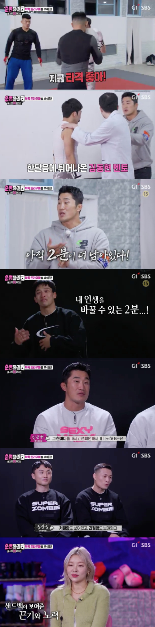 이어 정찬성은 "강해지기 위해 운동하는 사람이 가장 센 것 같다. 원래 강했던 사람보다"라고 말했다. 김동현은 "'순정파이터'에서 제가 찾던 선수다"라고 소감을 전했다. 이에 샌드백은 "제가 못한다고 생각해 포기하고 싶었던 적도 많은데"라며 눈물을 흘렸다.
