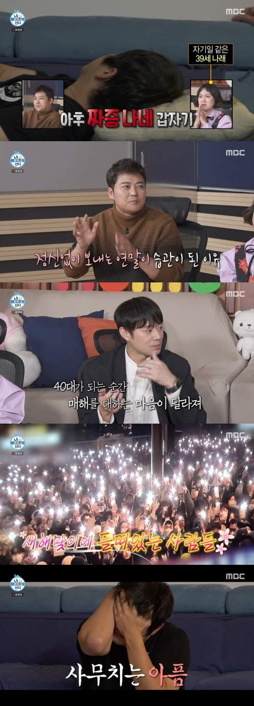 이후 기안84는 TV를 보며 "내 30대도 4분 남았구나"라며 괴로워해했다. 기안84는 "솔직히 덤덤할 줄 알았다. 좀 싫었다. 청춘과 젊음에 대한 갈망이 심하다. 만화도 고등학생, 군인, 대학생 젊은 사람들의 이야기를 그렸었고 청춘보다 좋은 게 없다고 생각한다"고 전했다. 이에 전현무가 "저도 그랬다. 그 헛헛한 마음 때문에 연말에 일을 많이 잡는다"며 공감했다. 천정명은 "40대 되는 순간 그때부터 느낌이 확 오더라"라고 설명했다. 코드쿤스트는 "이렇게 우울하게 받아들이지 말자"라고 전했다. 기안84는 TV에서 2023년을 알리는 종이 울리자 "아휴. 청춘도 다 끝났네"라며 괴로워했다. 기안84는 "아이고 잘 가라, 30대"라며 인사했다.