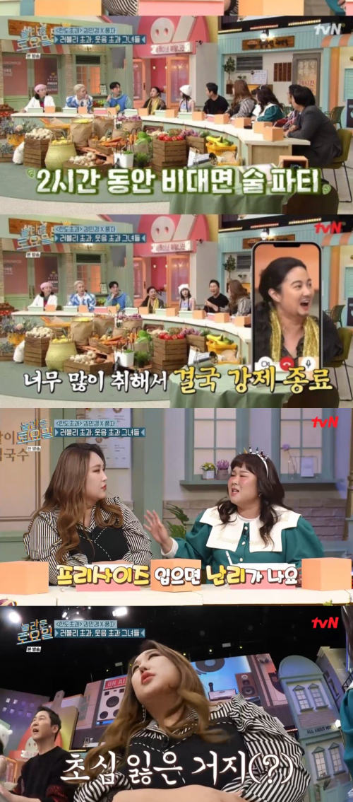 풍자는 "영상통화로 같이 2시간 정도 술을 마셨다"라고 말했고, "박나래가 너무 바쁘니 만날 수가 없어서 2시간 동안 영상통화로 술을 마셨다"라고 설명해 놀라움을 자아냈다. 박나래는 "만나고 싶어도 서로 집이 멀고 그래서 새벽에 통화를 했고, 영상통화까지 하게 됐다"라고 설명했다. 이어 박나래는 "영상통화로 초면에. 근데 영상통화로 내가 취하더라"라고 말했고, 풍자는 "너무 많이 취해서 강제 종료하시더라"라고 말해 좌중을 폭소케 했다.