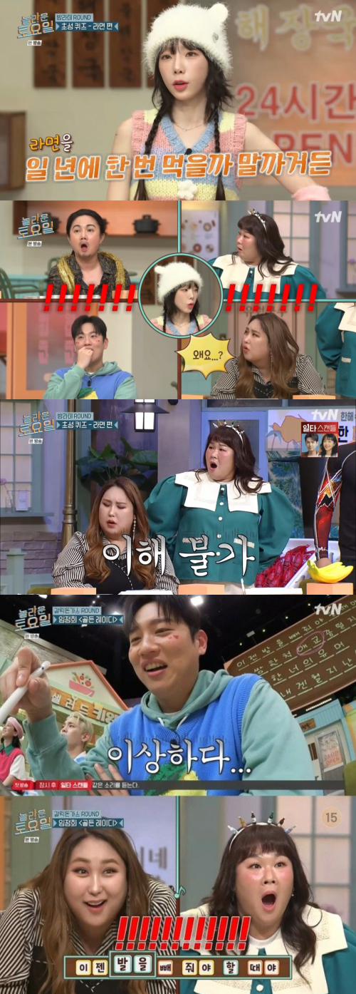 간식 라운드에서는 밤라테를 걸고 라면 초성 퀴즈에 도전했다. MC 붐은 "태연 씨가 좀 어려울 수도 있다"고 말했고, 태연은 "제가 라면을 1년에 한 번 먹을까 말까 한다"고 고백했다. 이에 풍자와 김민경은 충격을 받았고, 태연은 "너무 헤비해서"라고 이유를 설명했다. 김민경은 "그게 헤비해요?"라고 되물어 웃음을 자아냈다.