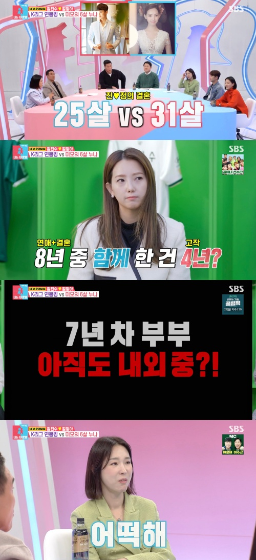 이날 김정아는 인터뷰에서 남편 김진수와 "8년 중 함께 산 기간은 4년이다. 결혼식을 치르고 직후에 출국했다"고 전했다. 김진수는 "제가 원정 가거나 국가대표팀으로 가면 쉬지 못한다"고 설명했다. 김정아는 "솔직히 얘기하면 너무 어색하다"고 말해 충격을 안겼다. 김정아는 "마주 보고 얘기하는 게 낯설어서 안 하게 되고 손잡고 다니는 것도 남편이라는 생각보다 자주 못 보는 남자친구 느낌?"라고 전했다.