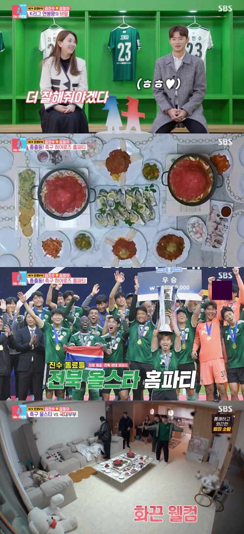 이후 김정아는 특별한 손님들을 위해 14첩 한 상을 선보였다. 특별한 손님들의 정체는 바로 김진수의 동료 송민규, 이용, 박진섭, 홍정남, 홍정호였다. 김진수는 동료들을 놀려주기 위해 소파에 몸을 감췄다. 김정아는 숨어있는 남편을 위해 "잠깐 뭐 사러 갔다"고 거짓말했다. 이후 김진수 소리를 지르며 동료들을 놀랬다. 서장훈은 "저거 사실 초등학생도 잘 안 한다"고 말해 웃음을 자아냈다.