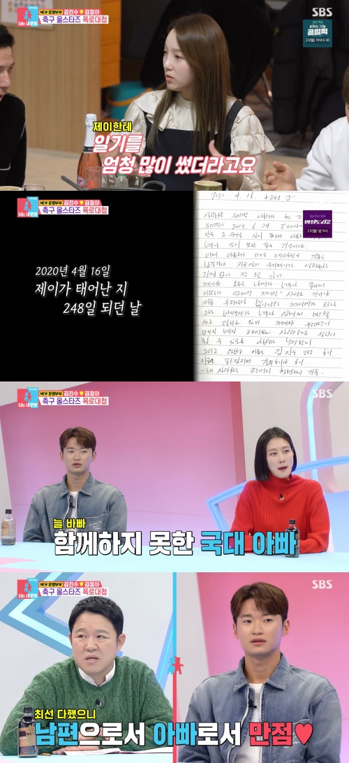 김정아는 "남편이 집에서 잘해?"라는 질문에 "집에 온 적이 없다"고 답했다. 동료들은 "맨날 숙소에 있더라. 어쩌면 근데 정아도 좋아할 수도 있다"고 말해 폭소를 안겼다. 김정아는 동료들에 "선수분들 일기 같은 거 쓰냐"고 물었다. 동료들은 "어릴 때는 썼는데 지금은 안 쓴다. 억지로 많이 썼었다"고 전했다. 김정아는 "얼마 전에 알았는데 남편이 이제 제이(딸)를 워낙 예뻐하니까 제이한테 일기를 많이 썼더라"라고 전했다. 김진수는 "매일 쓴다. 뭐 했는지랑 적는다"고 알렸다.