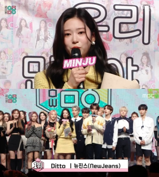 28일 방송된 MBC 음악순위 프로그램 '쇼! 음악중심'에서는 뉴진스의 'Ditto'(디토)가 1위에 올랐다. 뉴진스는 이날 '음악중심' 방송에 출연하지 않았지만 NCT DREAM, 태양을 꺽고 1위를 차지했다.