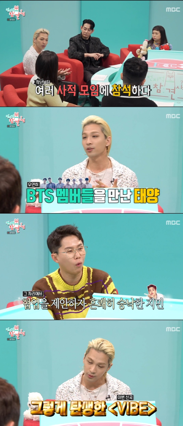 이날 6년만에 컴백한 태양은 BTS 지민이 피쳐링한 신곡 'VIBE' 노래를 전참시 멤버들 앞에서 선보였다. 어떻게 BTS 지민과 작업을 하게 됐냐는 홍현희의 물음에는 "작년부터 여러 이벤트나 저녁 사석 자리에 나가면서 BTS 멤버들을 만나게 됐다. 그 때 '이런 음악을 함께 해보는게 어떻냐' 라고 제안했고 '너무 좋다'고 하더라. 스튜디오로 와서 음악듣고 작업하면서 이 노래가 나오게 됐다"라고 협업하게 된 과정을 전했다.