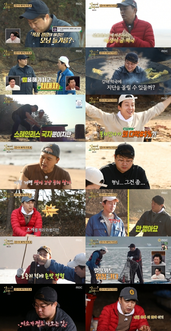 하지만 바다에서의 상황도 녹록치 않았다. 김광규가 배 위에서 넘어지며 미끼용 자하를 밟아 버렸고, 자타 공인 낚시왕(?) 김호중은 소득 없이 미끼만 뺏기는 등 악재가 이어졌다. 그래도 김호중의 속성 낚시 강의 덕분에 김광규가 망둥이를 낚아 모두를 감탄케 했다.