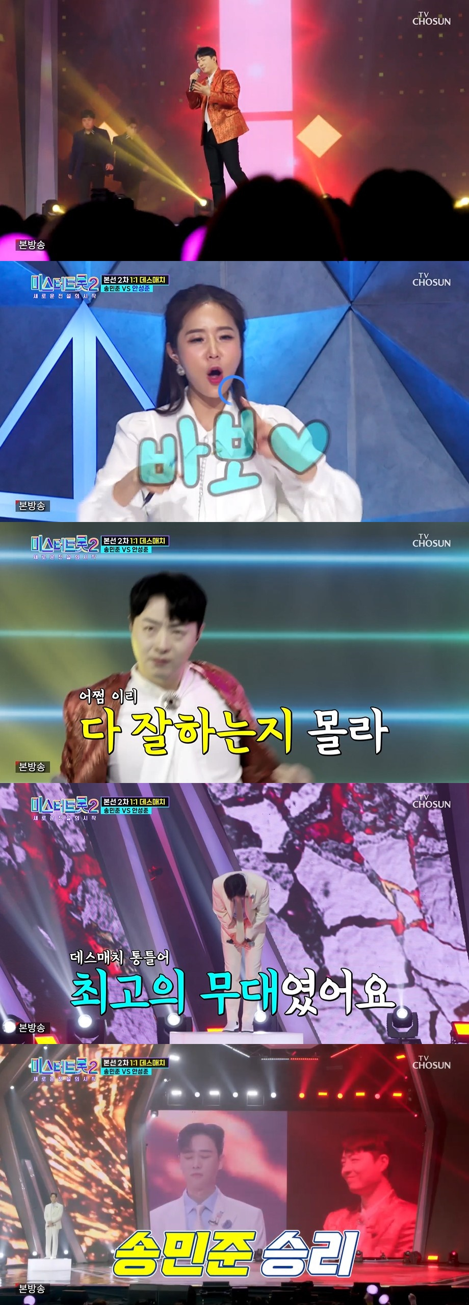 마스터 진성은 "이 얼굴에 눈물이 안 어울리지만 마음에 이슬이 내렸다. 송민준씨가 트로트의 대들보가 될 것 같았다. 상대방을 감동시켰다. 노래 표현을 너무 잘 했다"라며 감동을 전했다. 승부의 결과는 13 대 2로 송민준이 다음 라운드의 기회를 얻게 됐다.