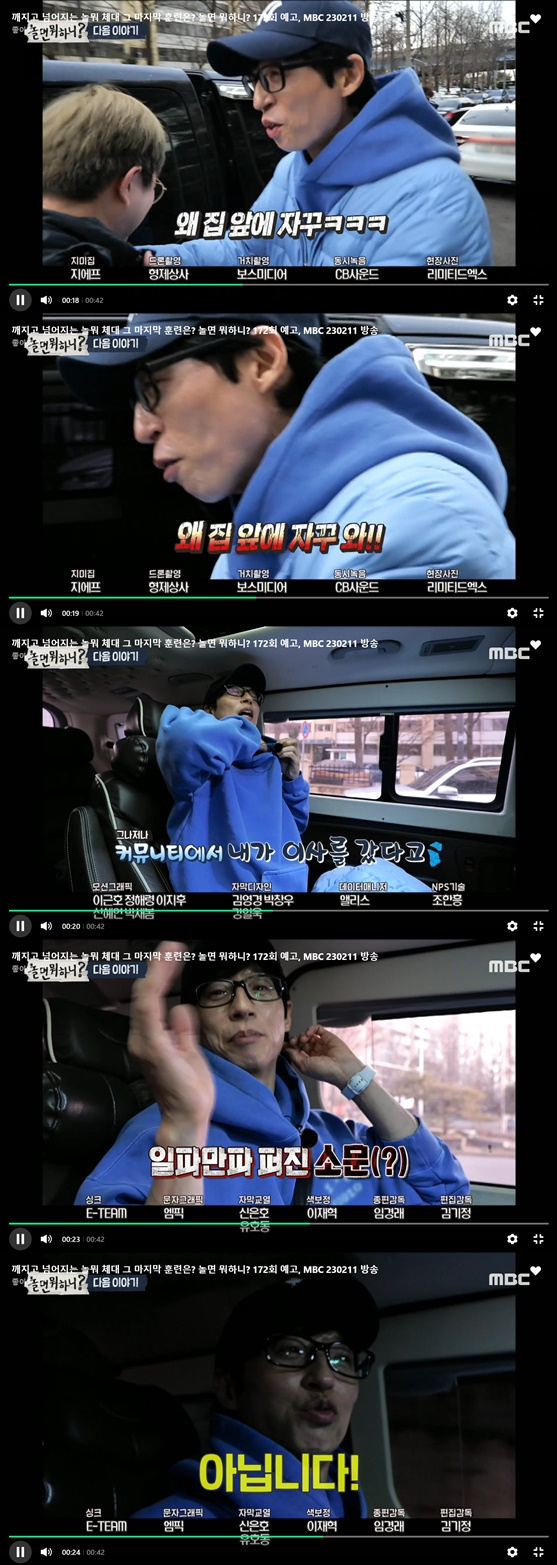 이날 예고편 영상에서는 '놀면 뭐하니' 제작진이 유재석의 압구정 아파트 앞으로 찾아간 모습이 공개 됐다. 유재석은 "뭐야, 왜 집 앞에 자꾸 와"라고 웃으며 차를 탔다. 이후 유재석은 "커뮤니티에 보면 내가 이사를 갔다고, 떡을 돌렸다고 하더라. 아니다. 누구지? 아닙니다"라고 작정하듯이 직접 해명 했다.