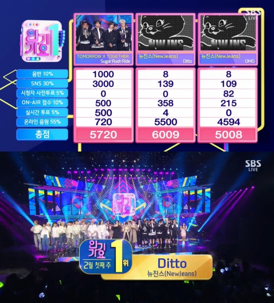 이날 1위 후보로 언급된 곡은 뉴진스의 '디토'(Ditto), '오엠쥐'(OMG) 그리고 투모로우바이투게더의 '슈가 러시 라이드'(Sugar Rush Ride)다. 뉴진스는 활동을 마치고 방송에 출연하지 않았음에도 불구하고 '디토'로 또 다시 1위를 거머쥐었다.