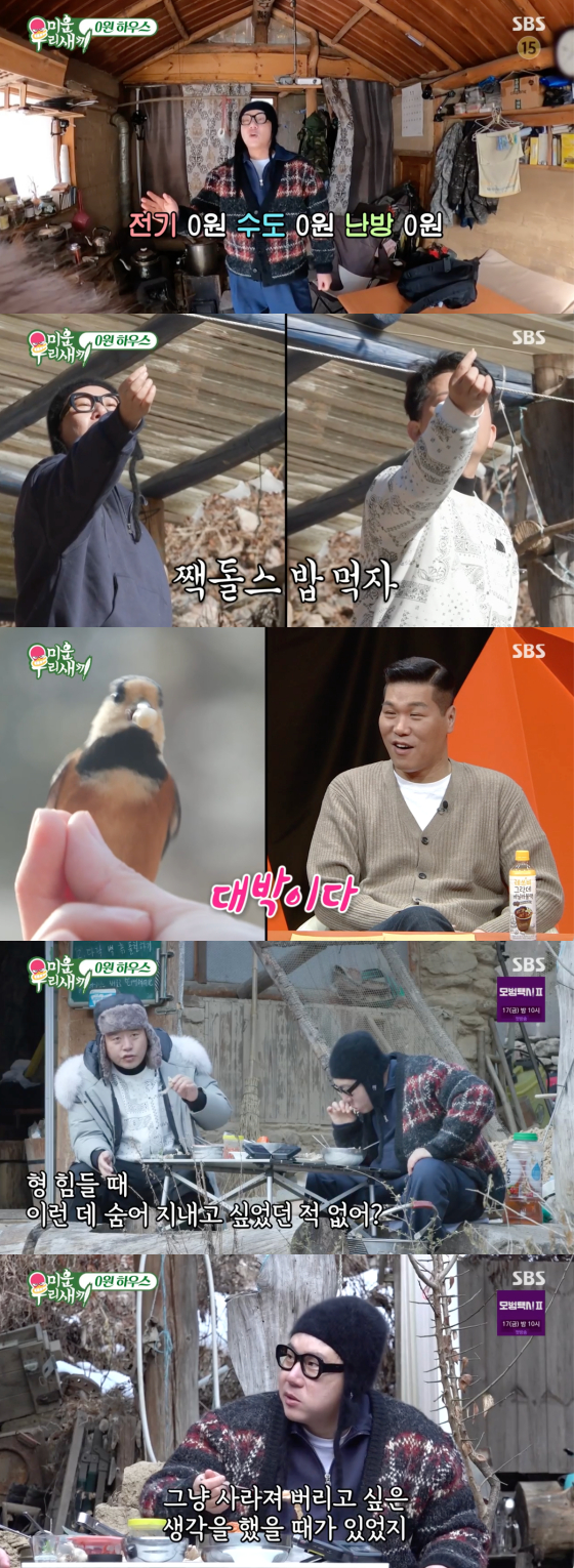 이상민과 김준호는 이날 통화도 되지 않는 깊은 산 속 '0원 하우스'로 떠났다. 김준호는 "핸드폰 안 터지면 안 된다. 나 지민이랑 연락해야 하는데"라며 괴로워한 반면, 이상민은 "얼마나 낭만적이냐. 아무도 나를 부르는 사람이 없다"며 자연을 만끽해 웃음을 자아냈다. 두 사람은 한 손에 새 모이를 쥐고는 요상한 휘파람 소리로 새 소리를 흉내내며 산새 "짹돌스"까지 불러 웃음을 더했다.
