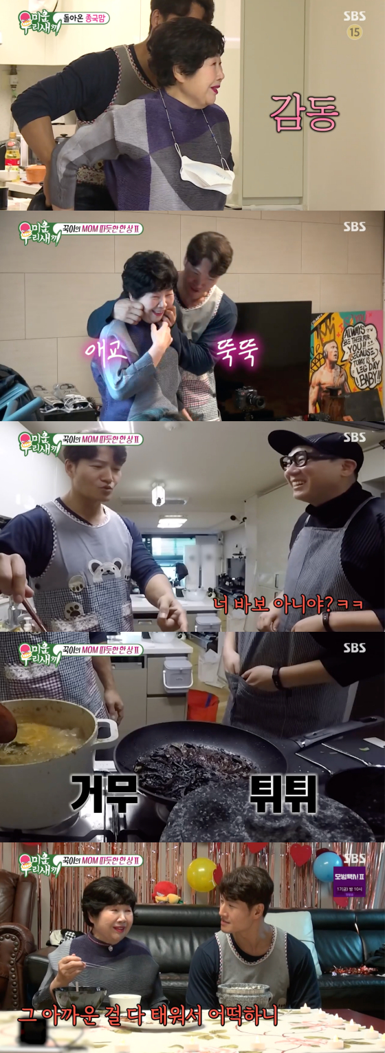 하지만 김종국 모친은 도리 뱅뱅 몇 점을 오히려 맛있게 먹어 눈길을 끌었다. 김종국 모친은 "맛있다"며 "그 아까운 걸 다 태워서 어떡하냐"고 타박해 웃음을 자아냈다. 김종국은 어머니가 자신이 만든 음식을 맛있게 드시자 내내 흐뭇한 미소를 지으며 동생들 앞에서 애교까지 부려 훈훈함을 더했다.