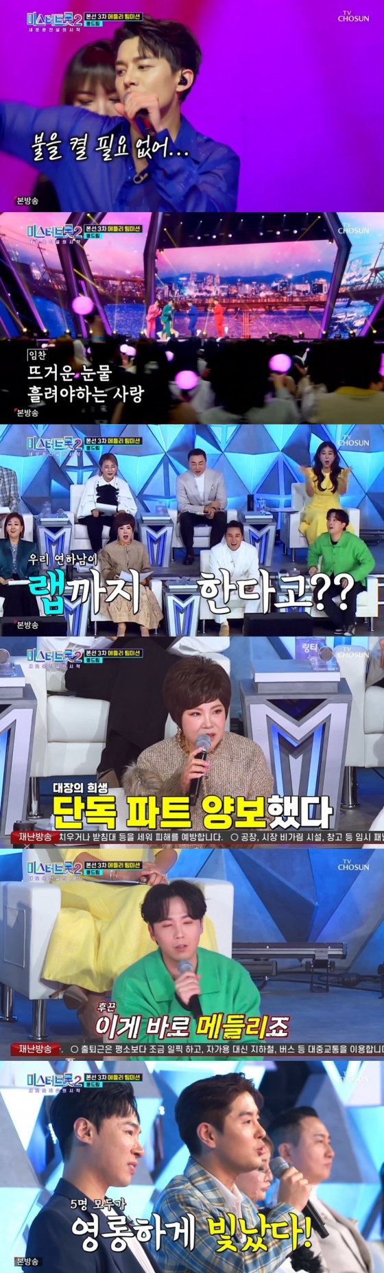 9일 오후 방송된 TV조선 경연 프로그램 '미스터트롯2-새로운 전설의 시작'에서는 본선 3차전 '메들리 팀미션' 경연이 그려졌다. '메들리 팀미션'은 총 2라운드로 구성되며 1, 2 라운드를 합산해 가장 높은 점수를 받은 팀이 다음 라운드에 진출하는 방식이다.